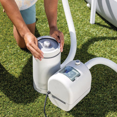 Las mangueras de la bomba se conectan de forma sencilla a las boquillas de entrada y salida de la piscina (38 mm) y se aseguran con conectores de rosca. Solo necesitas enchufarla a la corriente (220-240V).