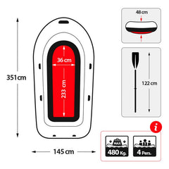 Este bote inflable de Intex tienes unas medidas de 351x145x48 cm y tiene capacidad para 4 personas con un peso máximo de 480 kg. Está fabricada con un material de vinilo de gran resistencia y calidad. Además, para mayor comodidad la embarcación tiene el suelo inflable y acanalado con tecnología I-Beam de Intex y 2 asientos inflables.
