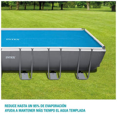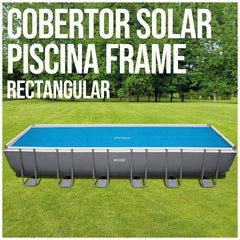 - Cobertor solar Intex para piscinas rectangulares de 732x366 cm. Cobertor de polietileno, de color azul y medidas: 716x346 cm