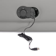 Incluye una bomba eléctrica integrada con alimentación USB (2A o más) compatible con cargadores de smartphone o de auto, permitiendo inflarlo o desinflarlo en aproximadamente 5 minutos y 30 segundos.