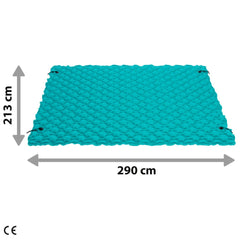 Es de color verde agua y, con sus medidas de 290x213 cm, está pensada para utilizar por 3 personas y recomendada para un máximo de 300 kg. Además, tiene unos pequeños pliegues que ayudan a que se adapte mejor a la silueta de cada persona.