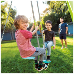 - Diseño: conjunto color verde, azul, naranja y gris compuesto por 2 columpios individuales con cadenas ajustables y 1 balancín de dos plazas con agarres antideslizantes y cómodo reposapiés