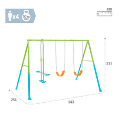 - Columpio infantil con medidas 343x254x211 cm y capacidad para 4 niños (peso máximo soportado de 192 kg)
