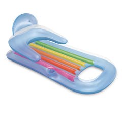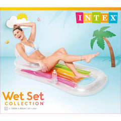 Colchoneta inflable Intex de medidas 160 x 85 cm. Está fabricada con paneles de vinilo transparente con fondo multicolor. La colchoneta tiene respaldo y reposabrazos para mayor comodidad. También incluye un porta bebidas de tamaño estándar. La colchoneta es ideal para utilizarla en piscinas o en la playa. No es aconsejable su uso en zonas de ríos.