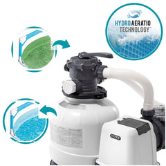 Todos los filtro de arena Intex adquieren el sistema Hydro Aeration Technology, es decir, un sistema que mejora la filtración, aumenta la pureza del agua, así como la cantidad de iones negativos de la superficie que ayudan a crear un ambiente higienizado, sin malos olores y libre de polución. (NO INCLUIDO)