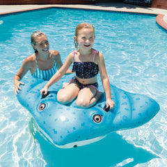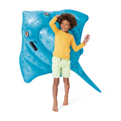 Desplázate sobre el agua con este fantástico flotador en forma de manta raya. El inflable es de color azul y blanco y cuenta con un diseño fotorrealista que dejará impresionado a todos los bañistas. Es un flotador inflable fabricado de vinilo resistente y duradero y con 2 asas de sujeción para mayor seguridad durante el baño.