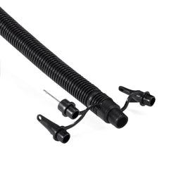 El inflador eléctrico Quick-Fill dispone de manguera de acordeón con un tamaño de 105 cm de largo y 3 boquillas intercambiables para adaptarse a diferentes tipos de válvulas (una de estas boquillas es de aguja). Dispone también de protector térmico, interruptor de encendido y apagado y asa para facilitar su transporte. Además, cuenta con un cable de conexión a la corriente de 220/240V y otro para conectarlo al cargador de un vehículo (ambos cables están incluidos).