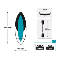 Para manejar el kayak se incluyen 2 remos de aluminio de 218 cm con pala acanalada, además de dos quillas, una fija y otra direccional, que puedes cambiar en función del lugar en el que vayas a utilizar la embarcación. Si lo utilizas para salir de pesca, el kayak dispone de 2 soportes para caña de pescar y zona de almacenaje en proa y popa con anillas soldadas a la lona para sujetar las bolsas (bolsas no incluidas). Y para grabar todas tus aventuras dispone de soporte ajustable y desmontables para colocar el teléfono o la cámara.