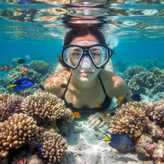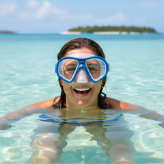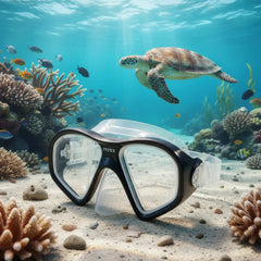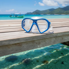 - Gafa tipo máscara que cubre nariz y ojos, lente en forma de lágrima para visión nítida y vaciado del agua más fácil