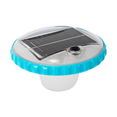 • Luz LED flotante Intex con carga solar para piscinas sobre suelo Intex. Medidas: 16.8x16.8x10.8 cm con superficie y base de color blanco y borde azul claro