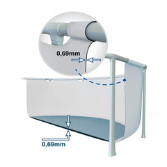 Las piscinas Prism Frame tienen una estructura metálica, compuesta por piezas tubulares independientes con tratado anticorrosión y antióxido a base de pintura epoxi en la parte exterior. Los tubos en forma de prisma están ensamblados unos con otros a través de un nuevo sistema de unión en “T” que garantiza un montaje fácil y hermético que evita la formación de óxido interno. Las barras de acero se unen al marco metálico sujetando la lona triple capa de PVC-Poliéster extra resistente formando un armazón rígido y estable que las convierte en unas piscinas resistentes y duraderas.