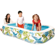 La piscina hinchable INTEX Tropical es ideal para niños desde los 3 años, con dimensiones de 229x152x48 cm y una capacidad de 600 litros. Su diseño tropical con hojas verdes y azules es llamativo y divertido, mientras que sus tres anillos hinchables aportan estabilidad y comodidad.