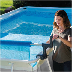 Hay múltiples razones por las que tener tu piscina estructural cubierta durante los meses de verano. Gracias a los cobertores solares que te ofrece INTEX en 8 medidas diferentes mantienes la temperatura del agua de tu piscina a la vez que la proteges de la suciedad. En ocasiones, sobre todo cuando nuestra piscina es de grandes dimensiones, poner y quitar el cobertor puede convertirse en una tarea difícil. Pensado para piscinas rectangulares con un ancho mínimo de 274 cm y máximo de 488 cm, este riel enrollador de cobertor solar es muy fácil de instalar y de usar. El riel enrollador de cobertor cuenta con dos piezas para colocarlas en el extremo de la piscina que se ajustan a la estructura tubular. Una de esas piezas lleva una manivela para enrollar y desenrollar el cobertor de forma fácil y sin esfuerzo. Para adaptar el riel enrollador al ancho de la piscina viene con 4 barras de aluminio que se conectan unas a otras. El largo mínimo del enrollador montado es de 305 cm y el máximo de 516 cm.