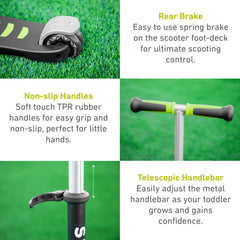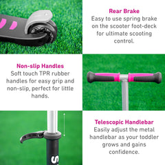 El T-Scooter T5 de Smart Trike está equipado con múltiples características, como la plataforma de pie de goma TPR, las empuñaduras y el freno trasero; todo lo cual ofrece una experiencia de conducción suave y segura.