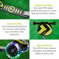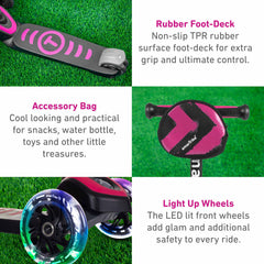 Las ruedas delanteras iluminadas con LED agregan seguridad y un aspecto fresco, las ruedas delanteras brillan mientras se desplazan y la bolsa de accesorios es ideal para almacenar los tesoros escondidos de su hijo.